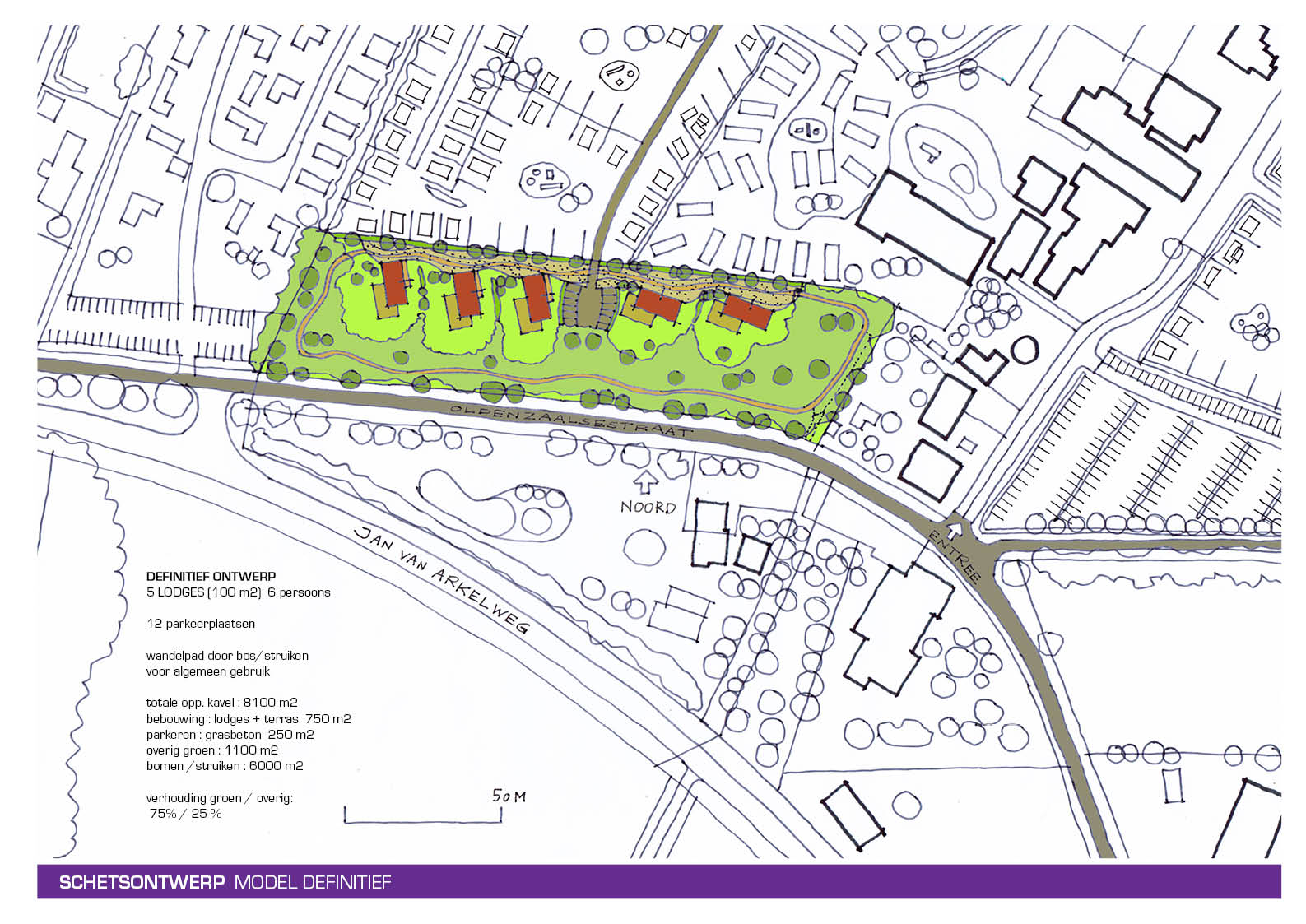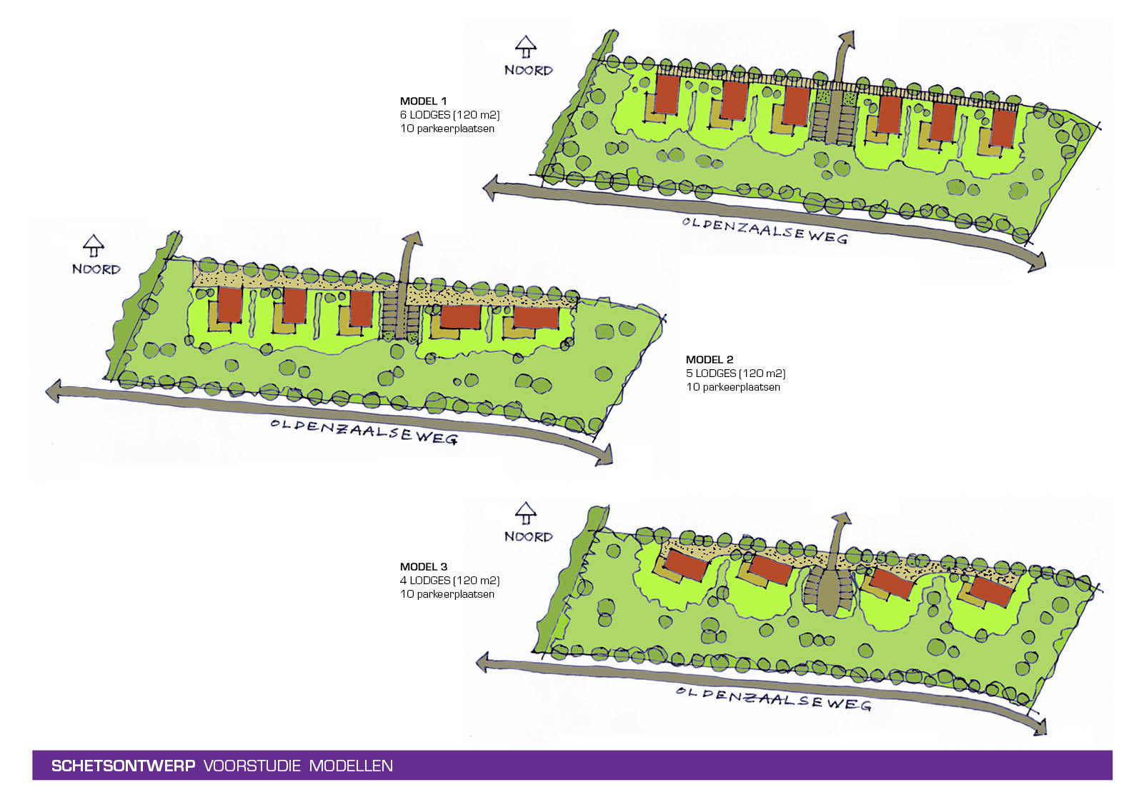 Ruimtelijke kijk over de gehele camping De Molenhof betreffende herinrichtingsmogelijkheden entree, parkeren en diverse campingvelden.