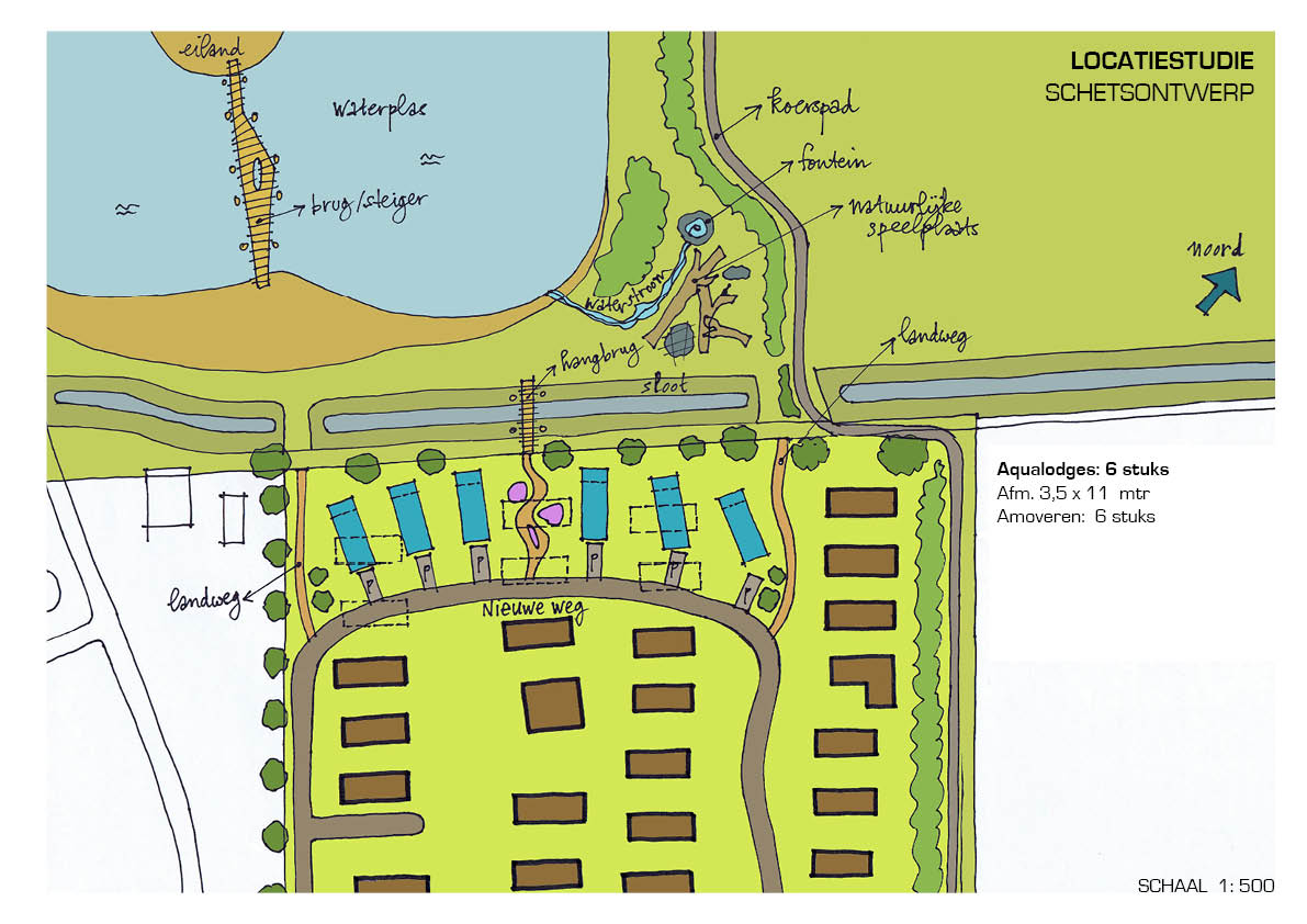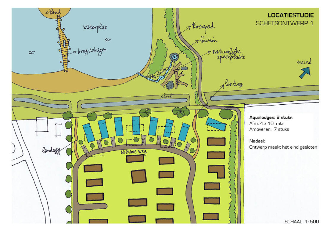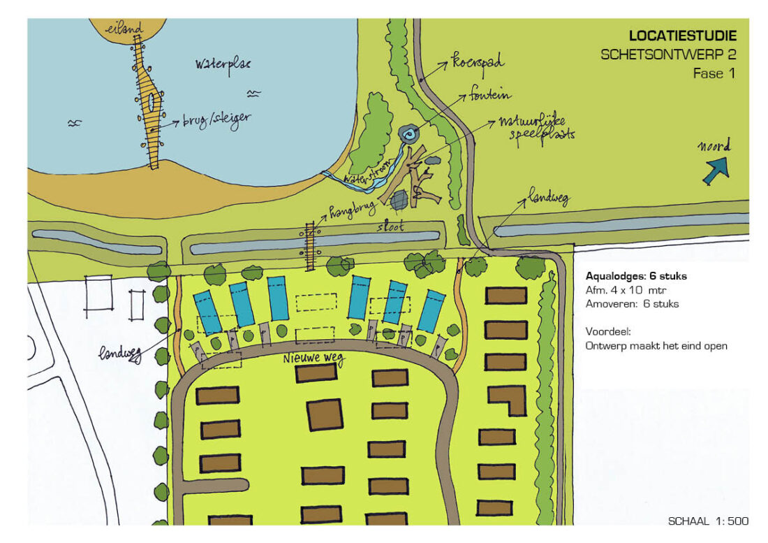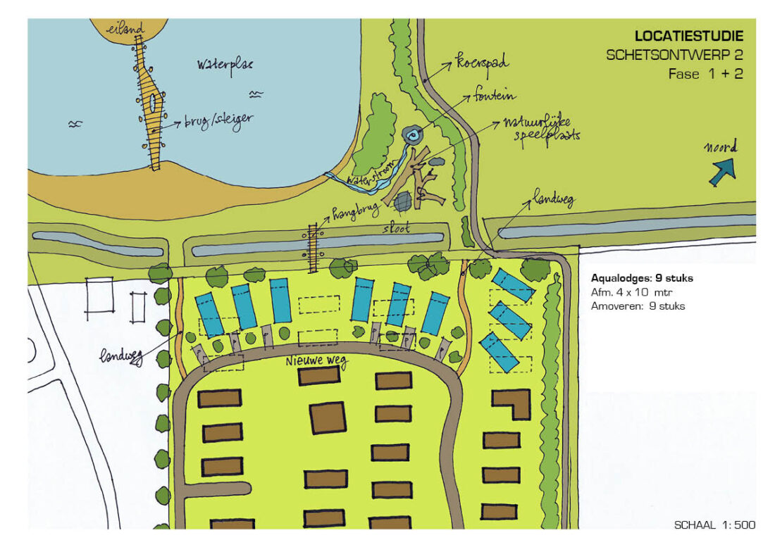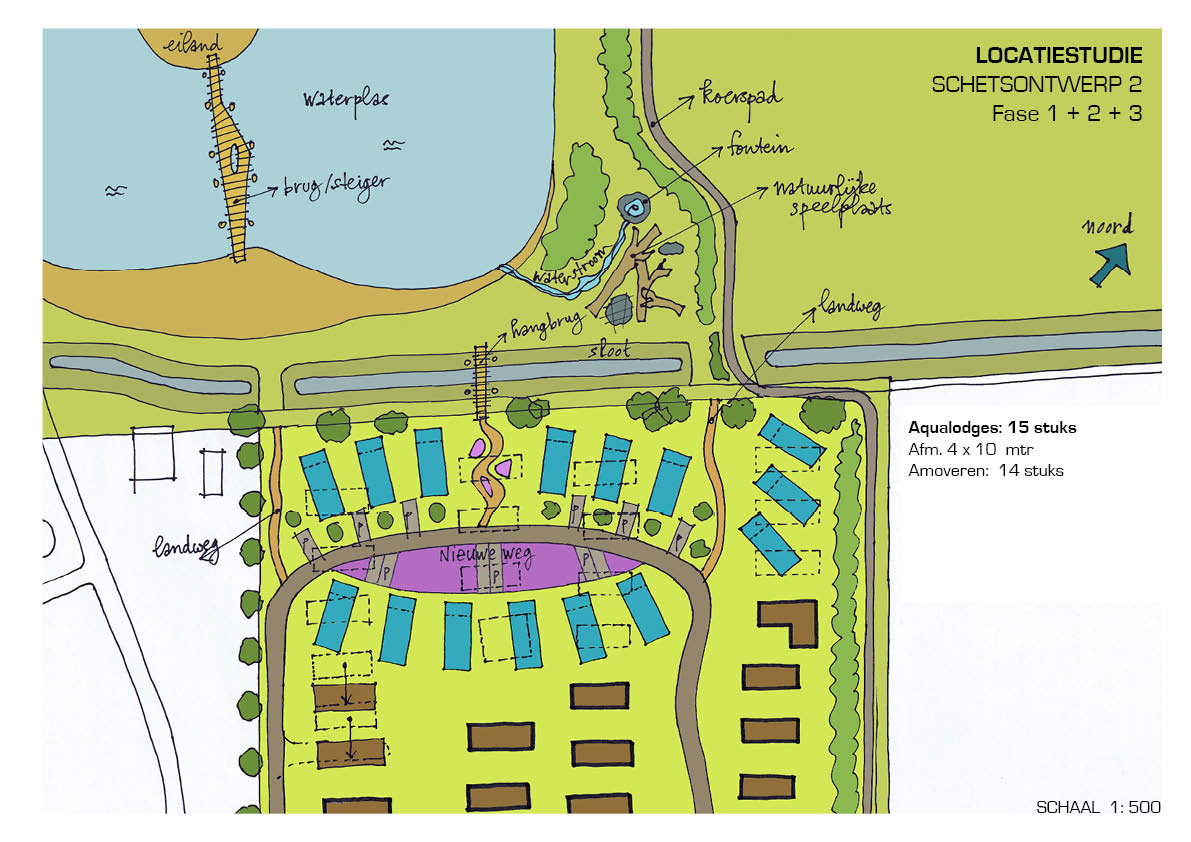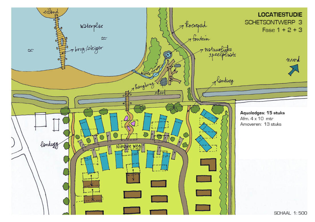 Ontwikkeling recreatielodges aan westzijde van de camping bij de vijver.